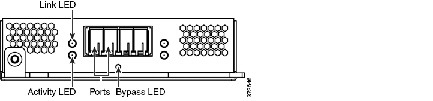 デュアルポート 40GBASE-SR4 光ファイバの設定可能なバイパス NetMod には、2 つの光ファイバ ポートとリンク、アクティビティ、およびバイパスの LED があります。