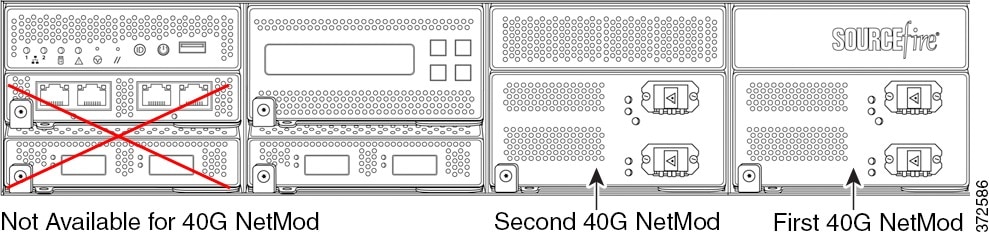 最大で 2 つの 40G NetMod を使用できます。1 番目の 40G NetMod をスロット 3 と 7 に、2 番目をスロット 2 と 6 に取り付けます。スロット 1 と 4 で 40G NetMod を使用することはできません。