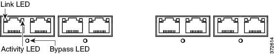 デバイスの自動バイパス機能を利用するためには、左側にある 2 つのインターフェイスあるいは右側にある 2 つのインターフェイスをネットワーク セグメントに接続する必要があります。自動バイパス機能を使用すると、デバイスで障害が発生した場合や電源を消失した場合でもトラフィックが流れることができます。インターフェイスを配線した後、Web インターフェイスを使用して、インターフェイスのペアをインライン セットとして設定し、そのインライン セットでパイパス モードを有効にします。