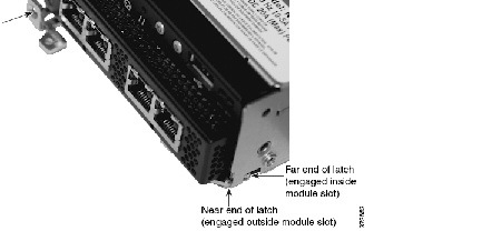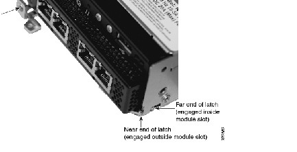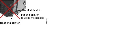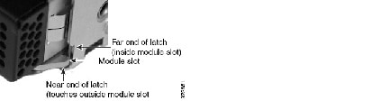 ラッチの奥の端がスロット内に入り、ラッチの近端がモジュール スロットの外側に接触するまで、モジュールをスロットに挿入します。