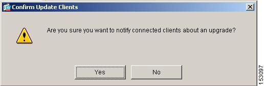 必要に応じて、クライアントのアップデートが必要な、最新の状態でない Windows クライアントを持つアクティブなユーザに通知を送信できます。この通知を送信するには、Client Update ウィンドウの Live Client Update 領域を使用します。トンネル グループを選択し(または All を選択)、Update Now をクリックします。接続中のクライアントにアップグレードを通知するかどうかを確認するダイアログボックス(図4-4)が表示されます。