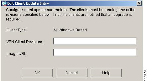 セキュリティ アプライアンス全体にわたって、選択したタイプのすべてのクライアントに適用するクライアント アップデートを指定します。つまり、クライアント タイプ、更新されたイメージを取得する URL または IP アドレス、およびそのクライアントの許可されるリビジョン番号を指定します。リビジョン番号は、カンマで区切って最大 4 つまで指定できます。OK をクリックした後に、該当するカラム(Client Upgrade ウィンドウのテーブル)にエントリが表示されます。