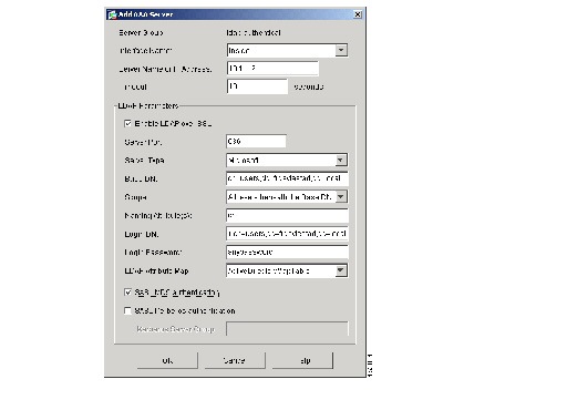 次に、使用する AAA サーバ グループと AAA サーバを設定します。2 つの AAA サーバ グループを設定する必要があります。1 つのサーバ グループは、ユーザ レコードの LDAP 検索を要求する認証サーバを含む認証サーバ グループとして設定します。もう 1 つのサーバ グループは、グループ レコードの LDAP 検索を要求する許可サーバを含む許可サーバ グループとして設定します。2 つのグループで大きく異なる点は、AAA サーバに別のベース DN フィールドが存在し、別の Active Directory フォルダを指定して検索を行うところです。