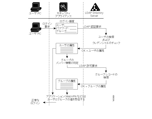 図6-1 に、LDAP ディレクトリ サーバを使用したセキュリティ アプライアンスのユーザ認証と許可の主なトランザクションを示します。