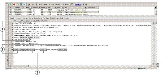 図8-8 に、HTTP ヘッダー アナライザの出力例に表示される action URI、非表示、ユーザ名、およびパスワードのパラメータを示します。これは一例です。出力内容は Web サイトによって大幅に異なることがあります。