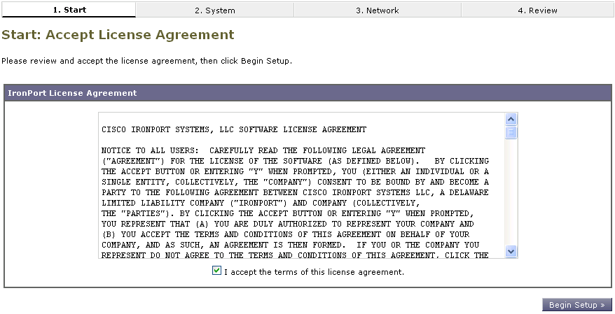 ライセンス契約書の参照から開始します。ライセンス契約書を参照し、同意する場合は、同意することを示すチェックボックスをオンにし、[Begin Setup] をクリックして続行します。