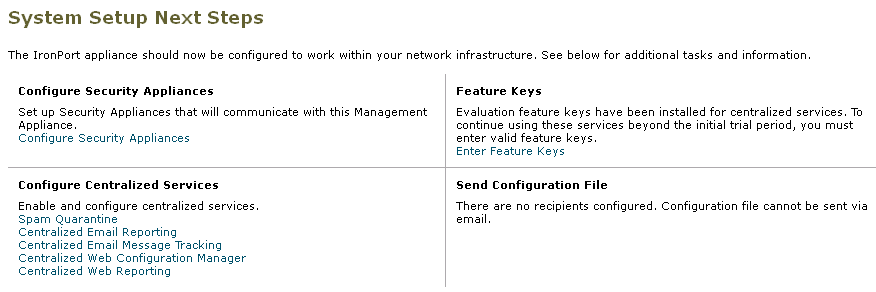 [System Setup Next Steps] ページのいずれかのリンクをクリックして、Cisco IronPort アプライアンスの設定を続行します。