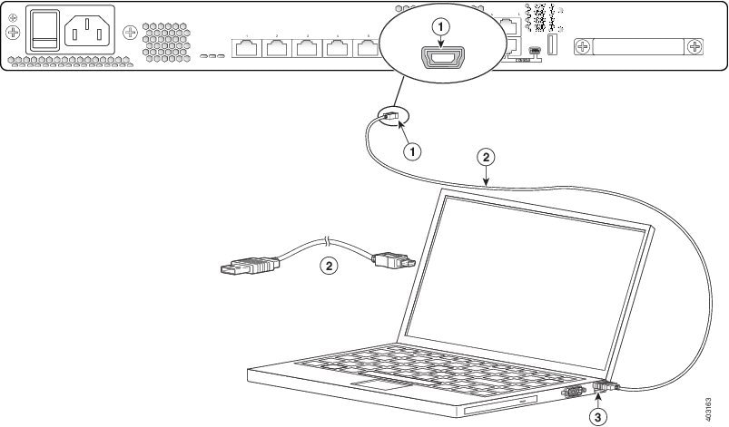次の図に示すように、USB 5 ピン ミニ USB タイプ B を USB コンソール ポートに接続します。