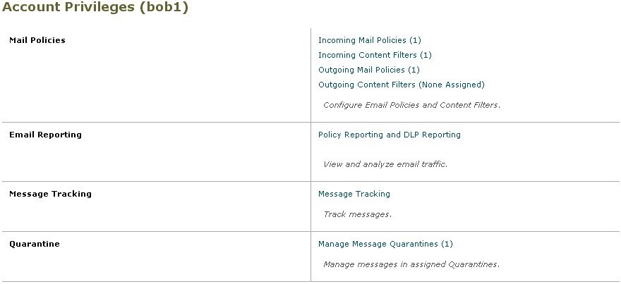 - アクセスなし(No access):委任管理者は、E メール セキュリティ アプライアンスのメール ポリシーとコンテンツ フィルタを表示も編集もできません。