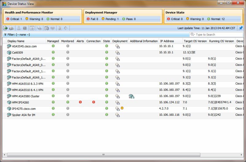 [Device View] ボタンを押すと、[Devices] ページが開きます。ここでは、Security Manager インベントリに対するデバイスの追加と削除、デバイスのポリシー、プロパティ、およびインターフェイスの一元管理を行うことができます。