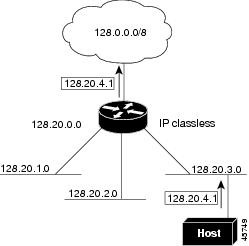図 41-2 では、クラスレス ルーティングがイネーブルとなっています。 ホストがパケットを 128.20.4.1 に送信すると、ルータはパケットを廃棄せずに、最適なスーパーネット ルートに転送します。 クラスレス ルーティングがディセーブルの場合、デフォルト ルートがないネットワークのサブネット宛てパケットを受信したルータは、パケットを廃棄します。