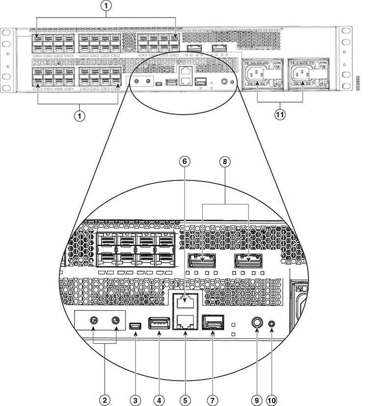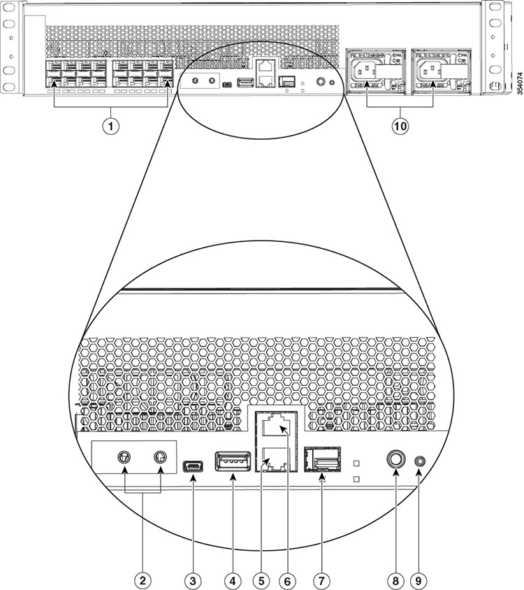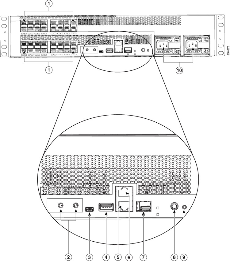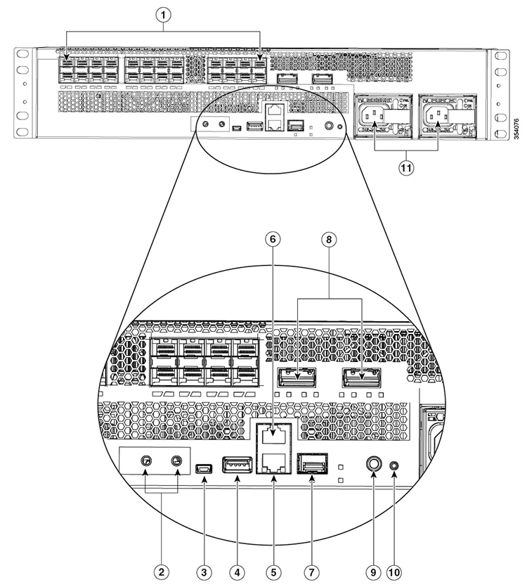 10 ギガビット SFP+ ポート(32 個)、電源スロット(2 個) |