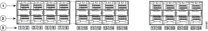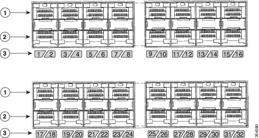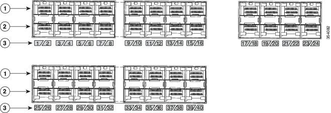 奇数番号のポートは上段、偶数番号のポートは下段にあります。次の図に、スイッチの各モデルにおけるポートと LED の番号割り当てを示します。このセクションでは、10 ギガビット ポートと 40 ギガビット ポートとの間のポート マッピングも示します。