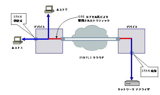 ERSPAN では、送信元 SPAN インターフェイスおよび宛先 SPAN インターフェイスは、IP ネットワークで相互接続した異なるデバイス上にある場合があります。ERSPAN トラフィックは GRE によってカプセル化されています。図 9-2およびERSPANを参照してください。