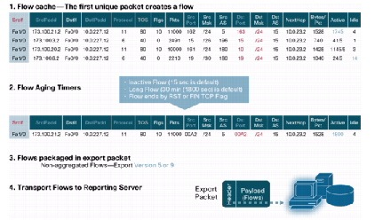 フローとは、送信元インターフェイス(またはサブインターフェイス)に到着する一方向のパケット ストリームであり、一連の条件と一致します。同じ送信元/宛先 IP アドレス、送信元/宛先ポート、プロトコル インターフェイス、サービス クラスを持つすべてのパケットは、フローにグループ化され、パケットとバイト数が計算されます。これにより、大量のネットワーク情報が、NetFlow キャッシュと呼ばれるデータベースに集約されます。