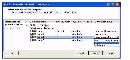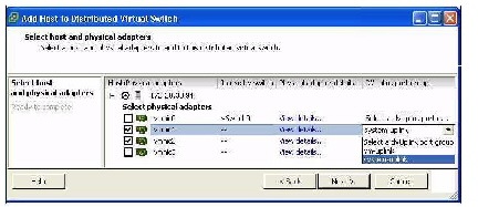 (注) [Add Host to Distributed Virtual Switch] ダイアログボックスが空の場合は、ホストが VMware ESX 4.0 サーバ用の Enterprise Plus ライセンスを持っていることを確認します。