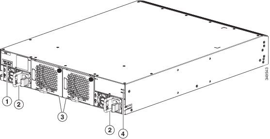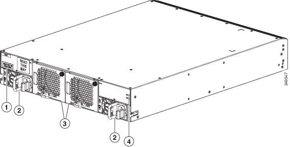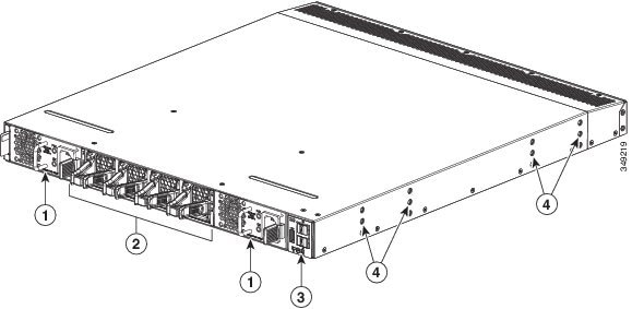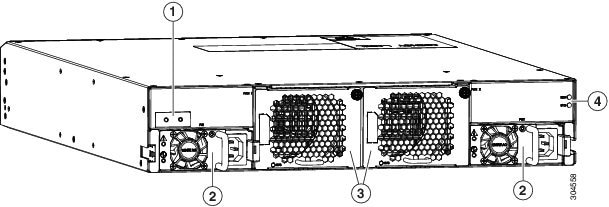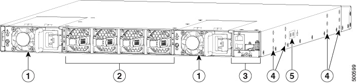 次の図は、シャーシの取り付け時またはそのモジュールの交換時に使用する、シャーシのファン側の機能を示しています。