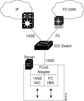 Cisco Nexus 5000 シリーズ スイッチでは、FCoE インターフェイスをサーバに、ネイティブ ファイバ チャネル インターフェイスを SAN に提供して、データセンター IOC をサポートします。