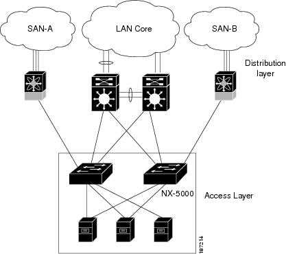 Cisco Nexus 5000 シリーズ スイッチは、データセンターの LAN 配信レイヤ スイッチへのアップリンクを搭載した、10 ギガビット イーサネット Top-Of-Rack(TOR)スイッチとして配置できます。 次の図に、構成例を示します。