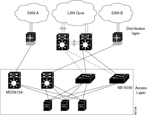 Cisco Nexus 5000 シリーズ スイッチの SAN ネットワーク側ポートは、Cisco MDS 9000 ファミリ スイッチに接続されます。 必要なトラフィック量により、各 MDS 9000 ファミリ スイッチに複数のファイバ チャネル ポートが接続されて SAN ポート チャネルとして設定されることがあります。