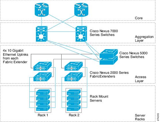 次の図に、単純かつ費用効果が高い 1 ギガビット TOR ソリューションを提供するために、Cisco Nexus 2000 シリーズ ファブリック エクステンダを Cisco Nexus 5000 シリーズ スイッチと組み合わせた場合の簡素化された設定を示します。
