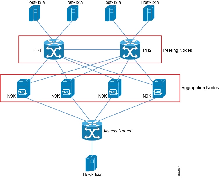 以下の図は、スタティック MPLS 送信元ルーティング トポロジを示しています。 アクセス ノードはスワップ操作を実行します。集約ノードはプライマリ パスに対してはポップ操作を実行し、バックアップ パスに対してはスワップ操作を実行します。