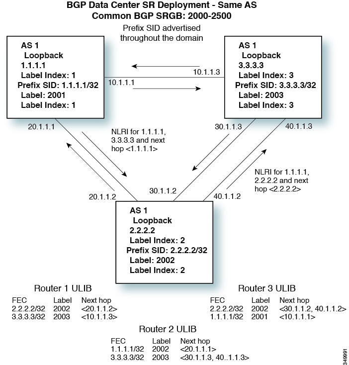 以下の単純な例では、3 台のルータのすべてが iBGP を実行して、互いにネットワーク層到達可能性情報(NRLI)をアドバタイズします。 また、ルータはそれぞれのループバック インターフェイスをネクスト ホップとしてアドバタイズすることによって、ルータ 2.2.2.2 とルータ 3.3.3.3 間に ECMP が提供されます。