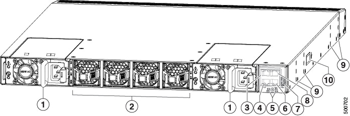 ファンと電源モジュールは現場交換可能であり、他のモジュールが取り付けられて稼働している限り、動作中にファン モジュールまたは電源モジュールを 1 個交換できます。取り付けられている電源モジュールが 1 個だけの場合、元の電源モジュールを取り外す前に空きスロットに交換用の電源モジュールを取り付けることができます。