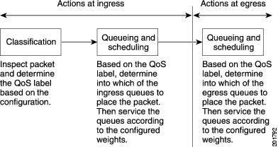 QoS を設定するには、パケットの分類、ポリシング、キューイングを行います。パケットはこのプロセスの間に変更されることがあります。IP パケットおよび非 IP パケットの分類では、受信パケットの CoS に基づいて、パケットに QoS ラベルが割り当てられます。ただし、この段階ではパケットは変更されません。割り当てられた CoS 値の指定のみがパケットとともに伝達されます。