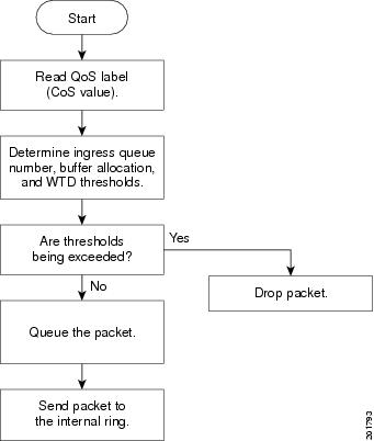 キューイングでは、QoS ラベルおよび対応する CoS 値を評価して、パケットを 2 つの入力キューのどちらに格納するかを選択します。キューイングは、輻輳回避メカニズムである Weighted Tail-Drop(WTD)アルゴリズムによって拡張されます。しきい値を超過している場合、パケットは廃棄されます。詳細については、「キューイングの概要」を参照してください。