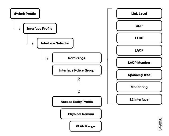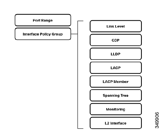 インターフェイス ポリシー グループはポートの動作を指示するテンプレートであり、AEP に関連付けられます。インターフェイス ポリシー グループは、前の段落で説明したポリシーを使用して、リンクの動作方法を指定します。また、同じポート設定が必要な多数のデバイスがポートに接続していることがよくあるので、再利用可能なオブジェクトもあります。リンクのタイプに応じて、3 つのインターフェイス ポリシー グループ(アクセス ポート、ポート チャネル、vPC)があります。
