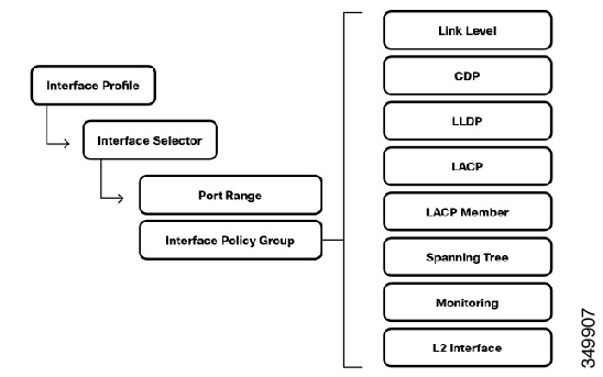 インターフェイス ポリシーはインターフェイスの動作を指示し、その後、インターフェイス ポリシー グループに関連付けられます。たとえば、CDP の無効化を指示するポリシーと CDP の有効化を指示するポリシーがある場合、リーフ スイッチに新しいデバイスが接続されたときにこれらを再利用できます。