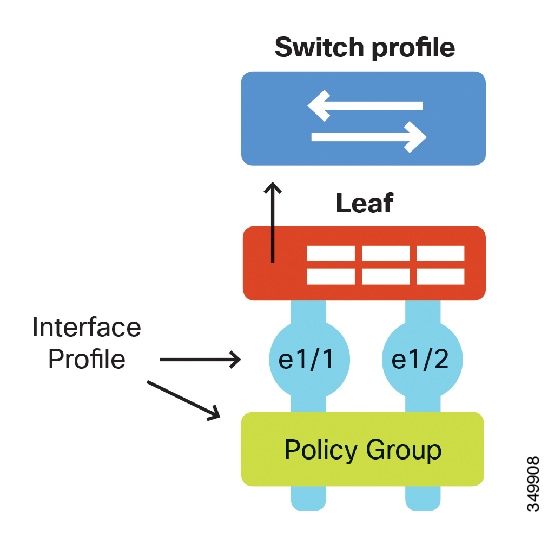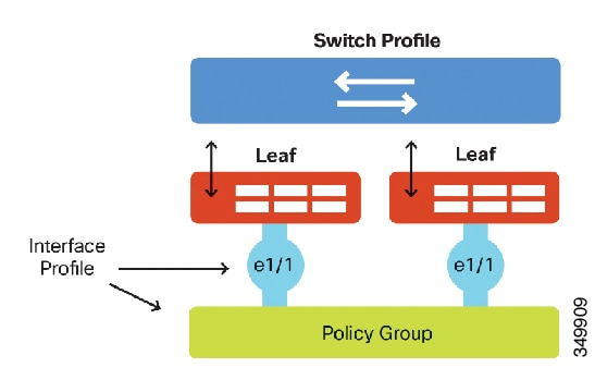 スイッチ プロファイルを使用すると、1 つ以上のリーフ スイッチを選択してインターフェイス プロファイルを関連付け、特定のノードにポートを設定できます。この関連付けによって、インターフェイスに設定がプッシュされ、インターフェイス ポリシーで設定されている場合は、ポート チャネルまたは vPC が作成されます。