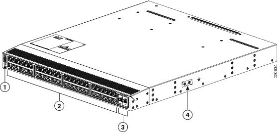 次の図は、シャーシの取り付け時またはモジュールの交換時に使用するポート側のシャーシ機能を示しています。