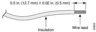 手順 2 12 ゲージまたは 8 ゲージのアース線の被覆を、0.5 インチ(12.7 mm)± 0.02 インチ(0.5 mm)取り除きます(図 3-10)。推奨されている長さ以上に被覆を剥がすと、コネクタからむき出しの導線がはみ出る可能性があります。単一孔アース接続には 12 ゲージの銅製アース線を使用します。二重孔アース接続には 8 ゲージの銅製アース線を使用します。