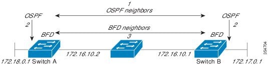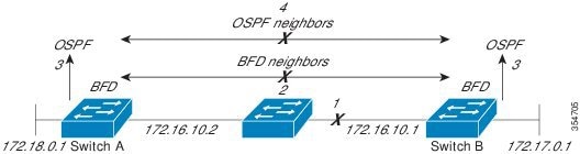 以下の図に、ネットワークで障害が発生した場合を示します(1)。OSPF ネイバー ルータでの BFD ネイバー セッションが停止されます(2)。BFD はローカル OSPF プロセスに BFD ネイバーに接続できなくなったことを通知します(3)。ローカル OSPF プロセスは OSPF ネイバー関係を解除します(4)。代替パスを使用できる場合、ルータはただちにコンバージェンスを開始します。
