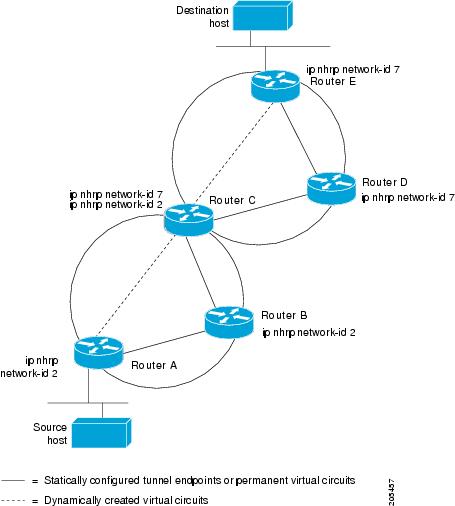 ルータ、アクセス サーバ、およびホストは、NHRP を使用して、NBMA ネットワークに接続された他のルータおよびホストのアドレスを検出できます。部分メッシュ NBMA ネットワークには通常、NBMA ネットワークの背後に複数の論理ネットワークがあります。このような構成において、NBMA ネットワークを通るパケットは、出口ルータ(宛先ネットワークに最も近いルータ)に到着するまでに、NBMA ネットワーク上で複数のホップを発生させる必要がある場合があります。