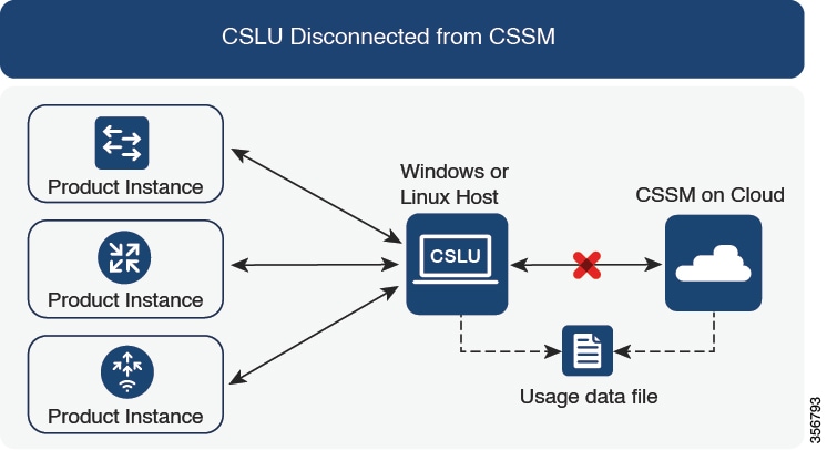 CSSM への接続なしで CSLU なし:特権 EXEC モードで license smart save usage コマンドを入力し、使用状況の必要な情報をファイルに保存します。次に、CSSM に接続しているワークステーションから、次のタスクを実行します。CSSM への使用状況データのアップロードと ACK のダウンロード > 製品インスタンスへのファイルのインストール