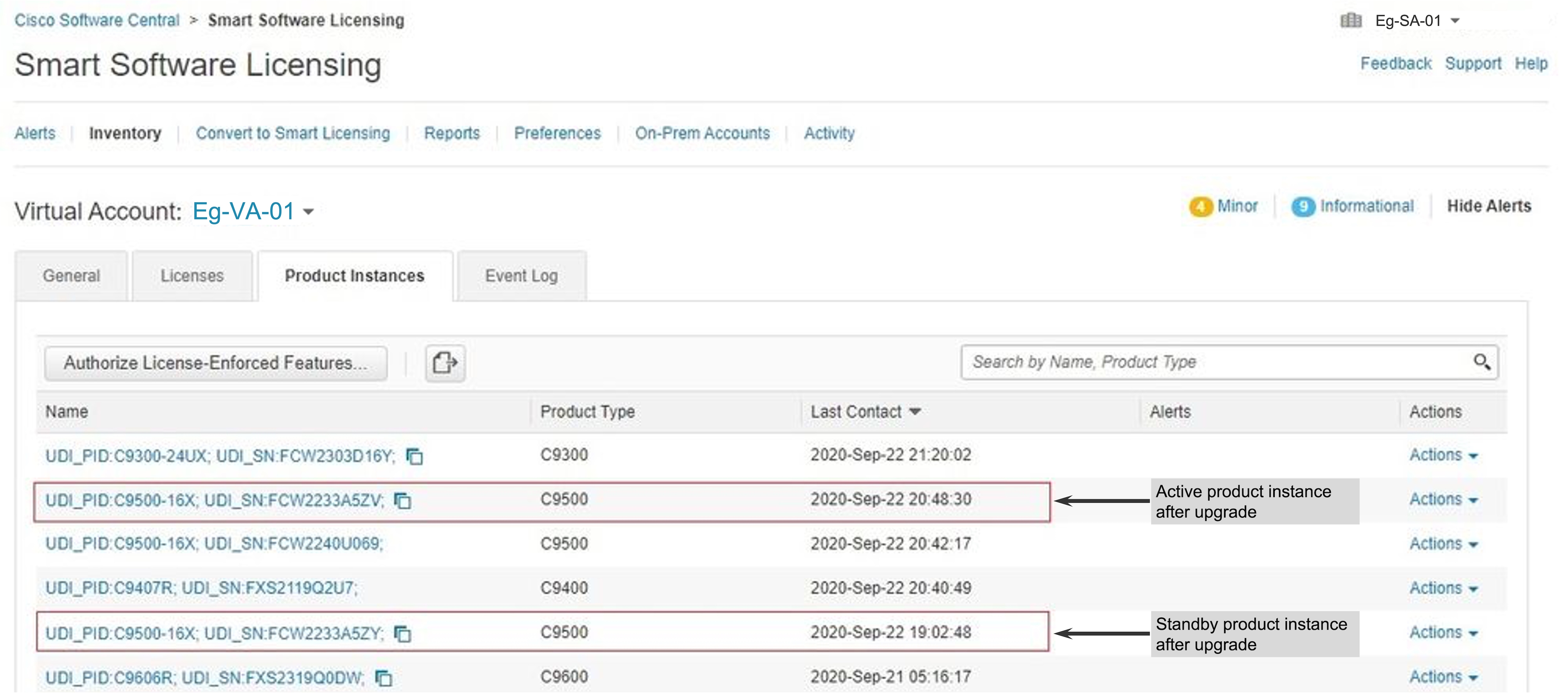 https://software.cisco.com で CSSM Web UI にログインし、[Smart Software Licensing] > [Inventory] > [Product Instances] をクリックします。