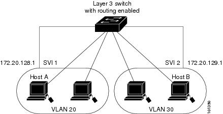 単一 VLAN 内のデバイスは、スイッチを通じて直接通信できます。異なる VLAN に属すポート間では、ルーティングデバイスを介さなければデータを交換できません。標準のレイヤ 2 デバイスを使用すると、異なる VLAN のポートは、ルータを通じて情報を交換する必要があります。ルーティングが有効に設定されたデバイスの使用により、IP アドレスを割り当てた SVI で VLAN 20 および VLAN 30 の両方を設定すると、外部ルータを使用せずに、デバイスを介してホスト A からホスト B にパケットを直接送信できます。