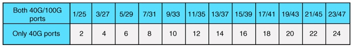 デフォルトのポート接続は 40G QSFP モジュールを使用するか、100G QSFP28 モジュールを使用するか、またはブレークアウトケーブルを使用するかによって異なります。40 G QSFPモジュール、100 G QSFP28 モジュール、および 4x10G ブレークアウトケーブルを組み合わせて使用できます。ブレークアウト インターフェイスの名前は次のようになります。