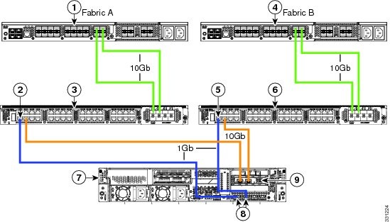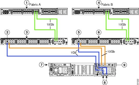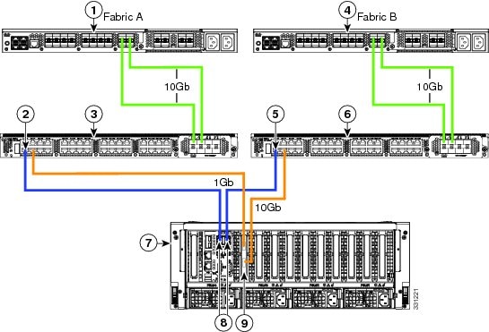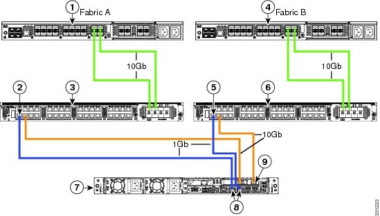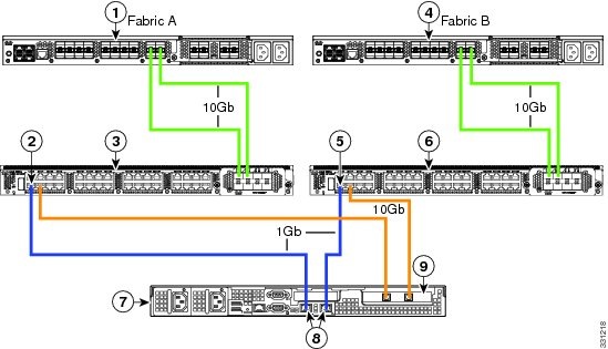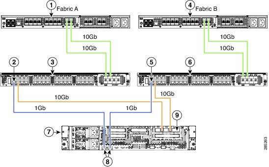 次の図は、C240 M3 サーバと Cisco UCS Manager を統合する場合の配線を表しています。 青色で示されたパスでは、管理トラフィックが伝送されます。 ゴールドで示されたパスでは、データ トラフィックが伝送されます。