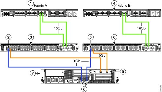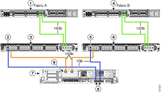 次の図は、C220 M3 サーバと Cisco UCS Manager を統合する場合の配線を表しています。 青色で示されたパスでは、管理トラフィックが伝送されます。 ゴールドで示されたパスでは、データ トラフィックが伝送されます。