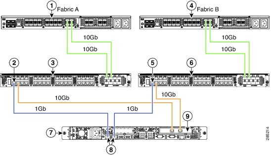 次の図は、C210 M2 サーバと Cisco UCS Manager を統合する場合の配線を表しています。 青色で示されたパスでは、管理トラフィックが伝送されます。 ゴールドで示されたパスでは、データ トラフィックが伝送されます。