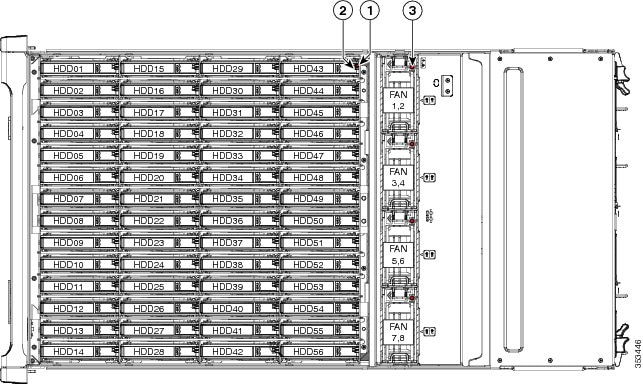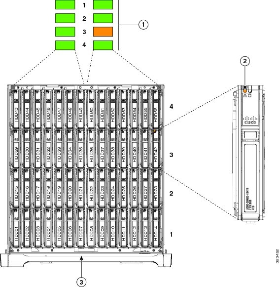 4 列の LED は、ドライブ ベイ(各行の 14 ドライブ ベイ)の 4 つの水平行に対応します。