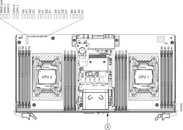 サーバ ノード ボードの端に内部診断 LED があります。これらの LED はサーバ ノードがシャーシから取り外されている間に表示できます。表示できる時間は、AC 電源を取り外した後から最大 30 分です。