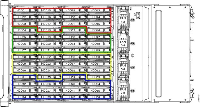 システムでは、主要シャーシ内に 56 の内蔵ドライブ ベイがあります。図 3-8 に、内蔵ドライブ ベイの番号を示します。内蔵ドライブを装着するときは、次のガイドラインに従ってください。
