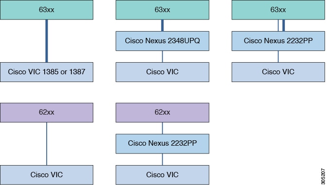Cisco Nexus 2232PP(4 X 10 G ブレークアウト ケーブル)または 2348UQ(40 G リンク) Cisco VIC 1385 または MLOM 1387(10 G リンク) |
