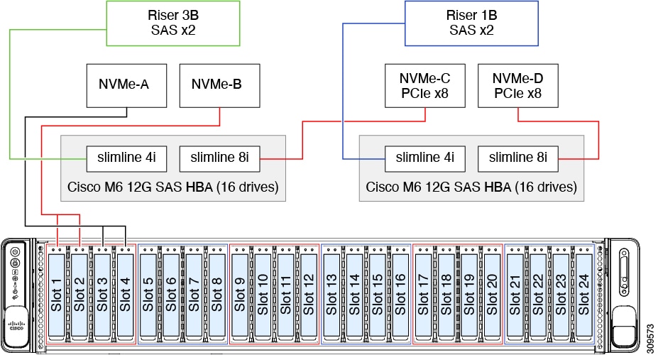 2 基の Cisco 12G モジュラ SAS HBA UCSC-SAS-M6 各コントローラは最大 12 台のドライブを制御します。 |