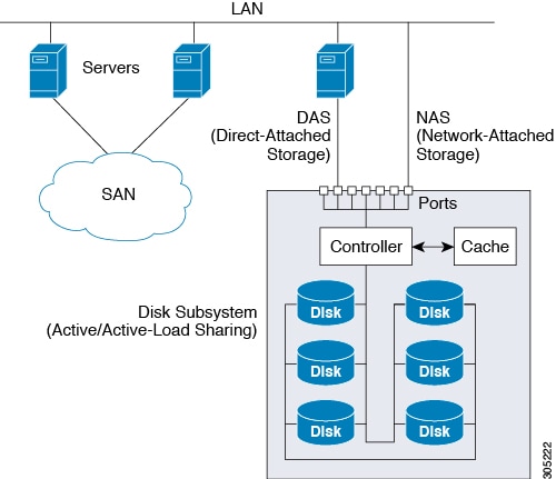 ダイレクト アタッチド ストレージ(DAS):これはサーバ内で使用可能なストレージであり、並行 SCSI 実装内のマザーボード経由でシステムに直接接続されます。DAS は一般に、キャプティブ ストレージと呼ばれています。キャプティブ ストレージ トポロジ内のデバイスは、ストレージ ネットワークへのダイレクト アクセスが提供されておらず、ストレージの効率的な共有をサポートしていません。DAS のデータにアクセスするには、フロントエンド ネットワークを経由する必要があります。DAS デバイスは、他のサーバに対するモビリティがほとんどなく、拡張性も高くはありません。
